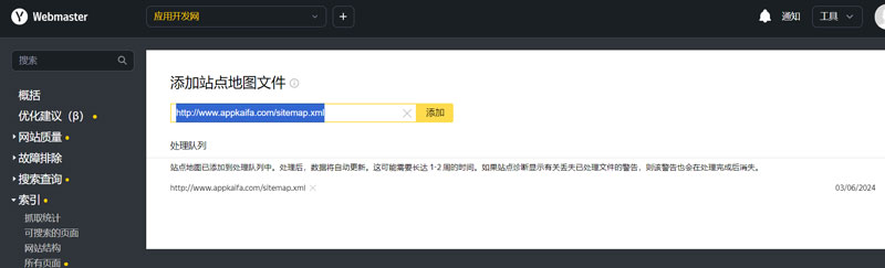 這里我們選擇 HTM 文件驗證。驗證通過后,可以進入索引內找到站點地圖文件,在框中輸入您的 XML 站點地圖 URL,然后單擊“添加”按鈕以提交您的站點地圖。確保提交正確版本的 http 或 https 以及 URL 中是否包含 www。提交后,您將看到狀態為“處理隊列”。(請見下圖所示)