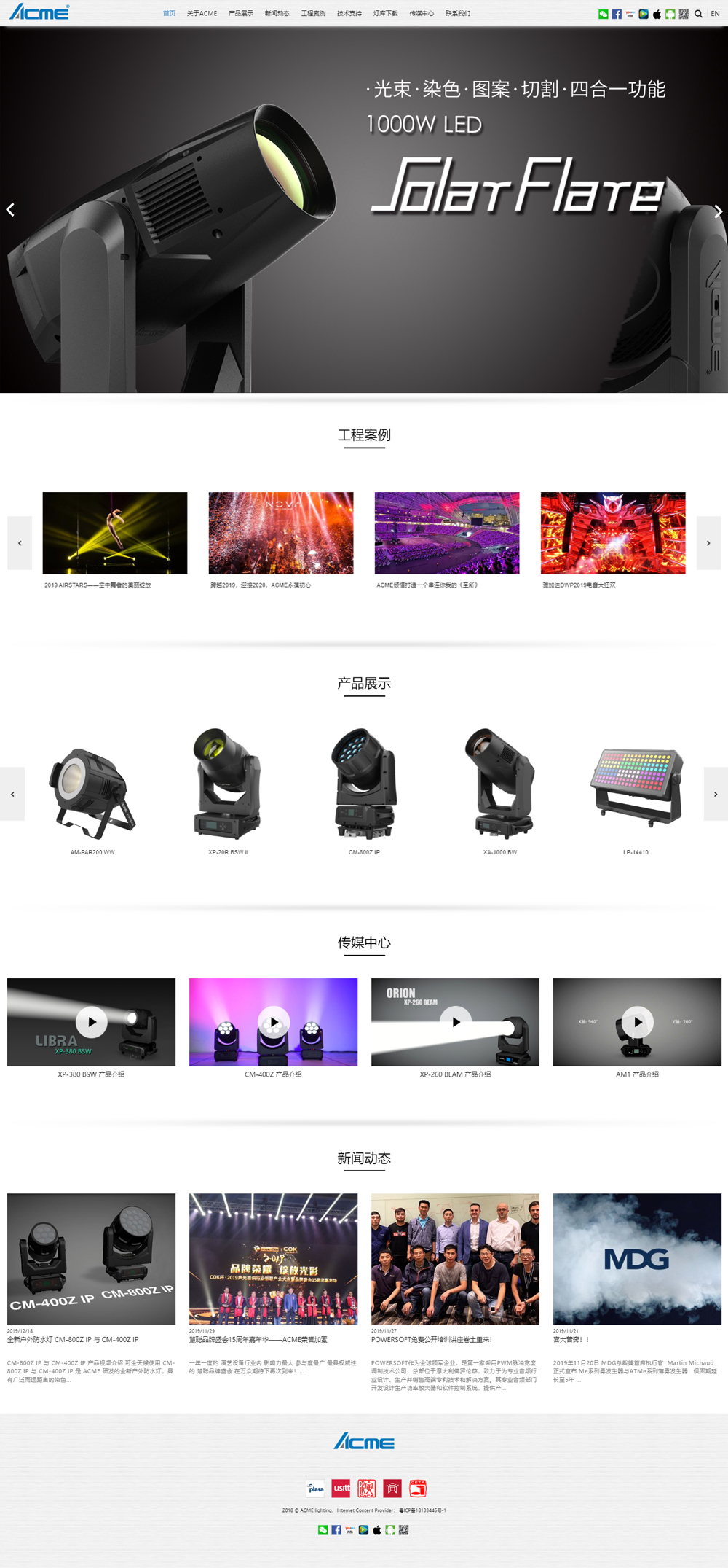 ACME成立于1985年,總部坐落于佛山市高明區"國家火炬計劃佛山新材料產品基地",擁有100余畝標準化現代廠房。歷經30年高速發展,ACME憑著卓越的產品和走在行業前沿的創新技術,已經成為全世界規模最大的娛樂和舞臺照明制造商之一,公司集專業舞臺燈光音響、建筑照明,研發,生產,行銷于一體,擁有銷售網絡遍布全球70多個國家和地區,產品深受認可和推崇。