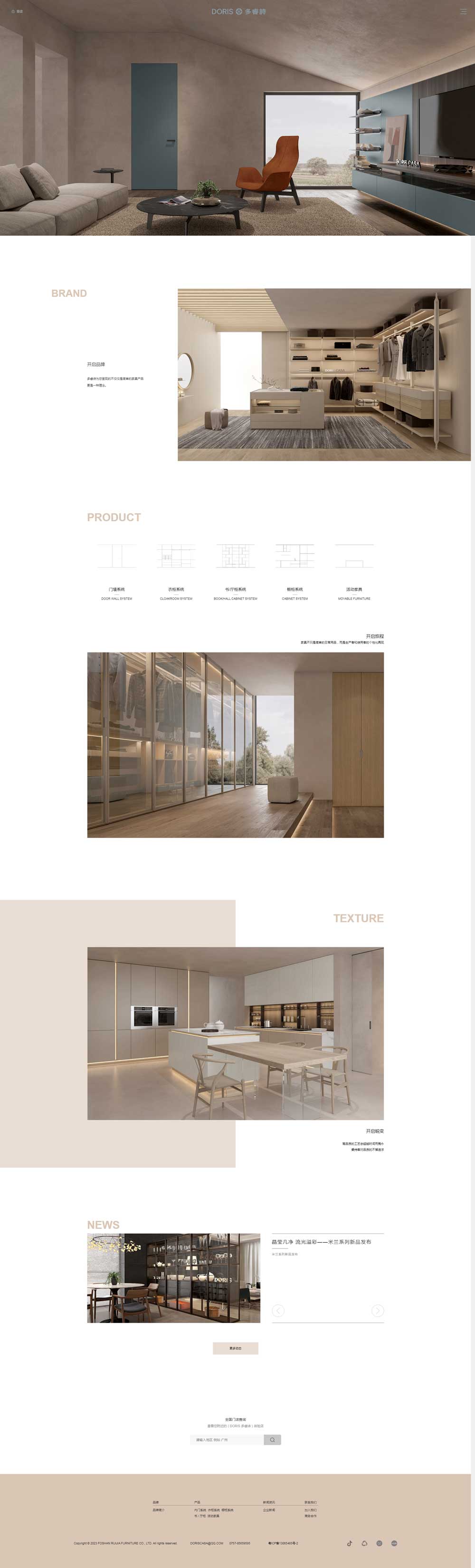 多睿詩(DORIS CASA)2013年品牌成立,2014年在廣東省佛山市南海區設立了專屬制造工廠,產品涵蓋了從衣柜、書柜、廳柜到櫥柜等各方面柜類產品。全面引入了進口板材、木皮、油漆、五金等,打造更適合于國內客戶的高端定制產品,投入極簡室內門系統的產品研發中,于2017年率先將門墻柜一體化的設計理念得以實現。攜手意大利原裝進口品牌Desiree,該品牌產品涵蓋沙發、軟床、休閑椅、茶幾、床墊等,各類活動家具,為客戶提供了更為系統化的產品配套方案。品牌總部遷址廣東省廣州市,旨在為品牌未來的發展儲備和培養各方面優秀人才。同年,選址華南高端家居賣場——廣州羅浮宮藝術家居中心開設了首家品牌旗艦店,店面面積達600平方米。