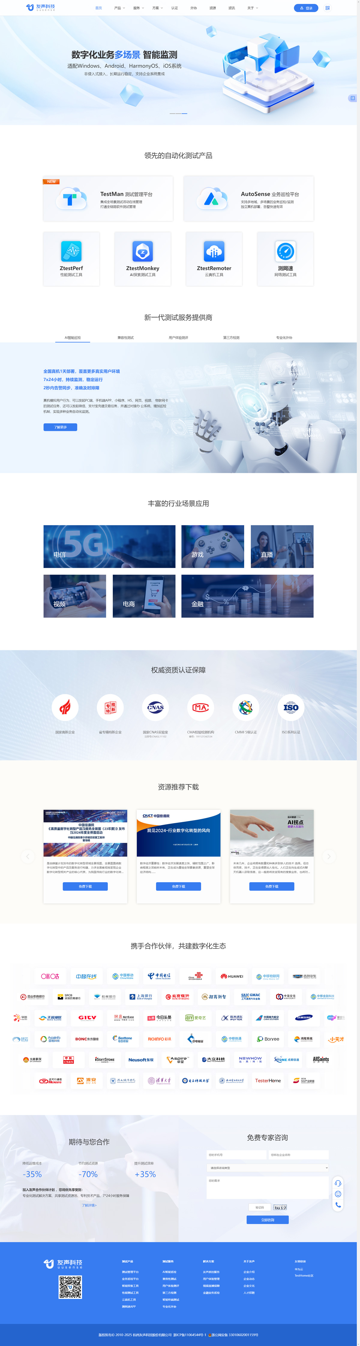 杭州友聲科技股份有限公司在自動化測試領域久負盛名,是國內(nèi)以 AI 技術驅動的行業(yè)領軍者。作為 “國家高新技術企業(yè)” 和浙江省 “專精特新” 企業(yè),友聲科技憑借 “AI + 資源 + 專家” 的三維賦能模式,構建起覆蓋全國的服務網(wǎng)絡,為多行業(yè)客戶提供高質量的數(shù)字化業(yè)務質量管理服務。公司自主研發(fā)的 AutoSense 業(yè)務巡檢平臺、TestMan 一體化測試管理平臺等一系列產(chǎn)品,深度融合 AI 前沿技術,在 UI 自動化測試等關鍵領域實現(xiàn)突破,其技術實力與服務能力在行業(yè)內(nèi)備受認可。隨著業(yè)務版圖不斷拓展,友聲科技急需一個更契合企業(yè)定位、更能展現(xiàn)技術優(yōu)勢的網(wǎng)站,來滿足品牌宣傳與客戶溝通需求。