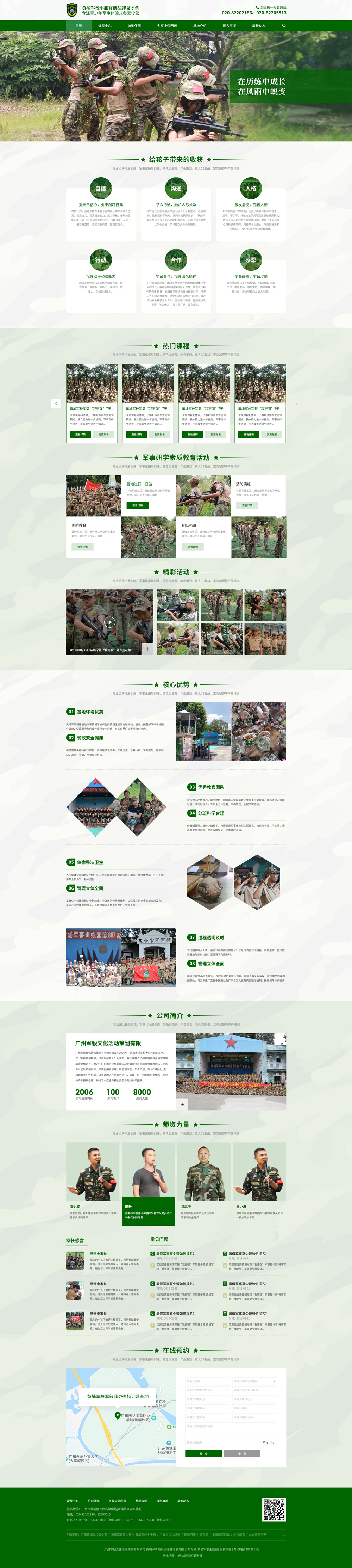 公司旗下“黃埔我更強”軍事對抗營?特種兵夏令營始于2006年,致力于打造廣東地區第一流大中小學生素質培訓品牌,旨在全面提升青少年綜合素質,培養青少年自信、感恩、豁達、堅強、勇敢、獨立做人的優秀品質;繼續秉承以往的優秀經驗,針對當前青少年教育的實際情況,不斷推陳出新,通過軍營角色體驗、體驗式(拓展)培訓、心理疏導、文化輔導、才藝特訓等方式,把素質教育與軍事體驗有機結合,真正做到以訓促管、以教促養提升青少年自身素質,實現成人成才目標,給家長滿意回饋。