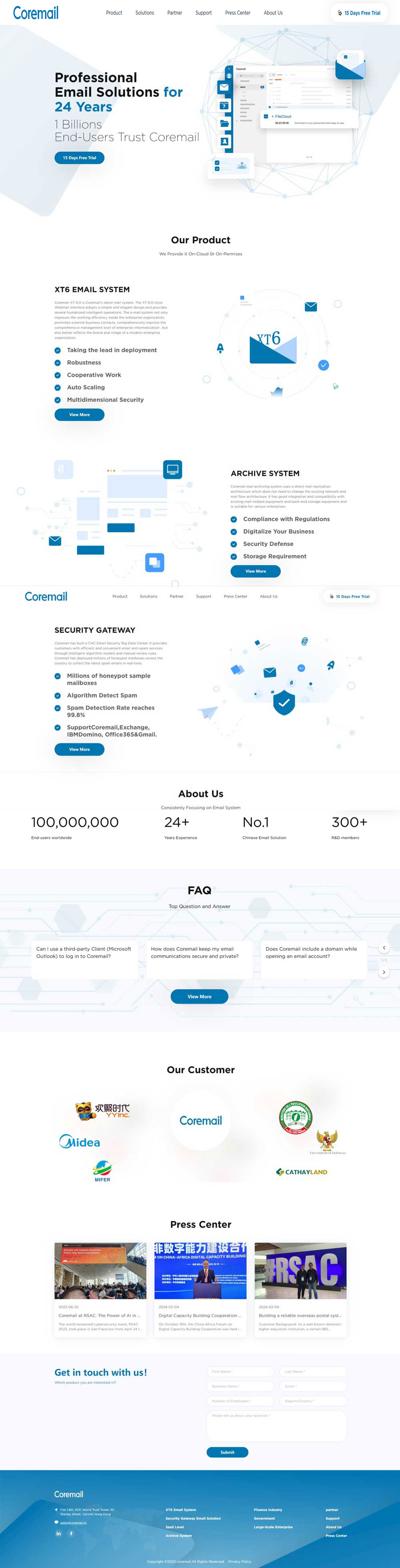 Coremail Hongkong Company Limited(香港訊捷有限公司)是中國領先的電子郵件解決方案服務提供商。Coremail品牌創立于1999年,2007年由網易戰略投資。公司總部位于廣州,在北京擁有近300名技術與服務團隊,上海、深圳、廈門、重慶、武漢等地。Coremail專注于企業 郵箱24年,郵箱技術領先,擁有超過10億終端用戶。我們為政府、教育、金融等提供郵件系統相關產品和解決方案行業,以及各種企事業單位。