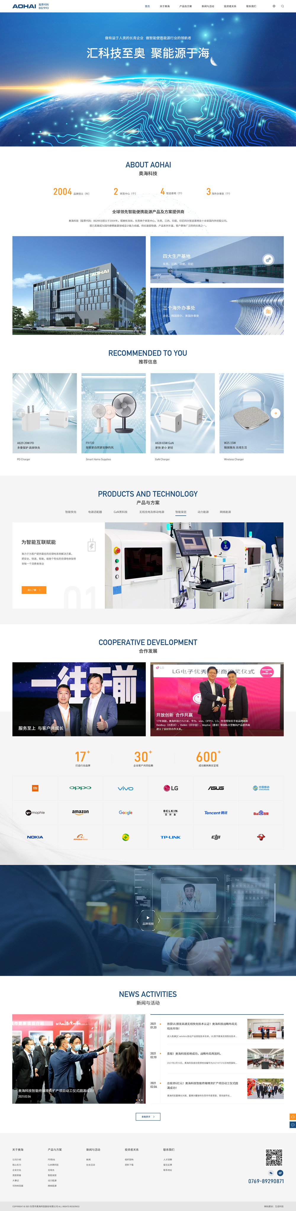 作為國家高新技術企業,奧海秉承精益求精的大國工匠精神,不斷提升快速充電、無線充電等技術,在智能消費類電子、智能終端、智能家居、大健康產業等領域大力拓展,公司產品應用逐步擴大到電視棒、家用路由器及AI智能物聯網硬件等領域。以科技創新驅動成長,奧海已成為全球眾多知名品牌的戰略合作伙伴,持續把安全、快速,極致個性化的充儲電體驗帶給每一個消費者。