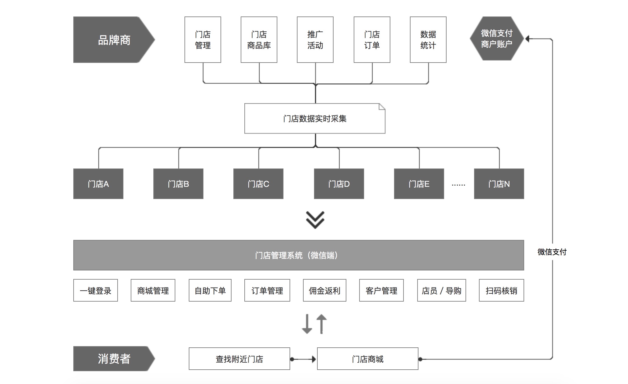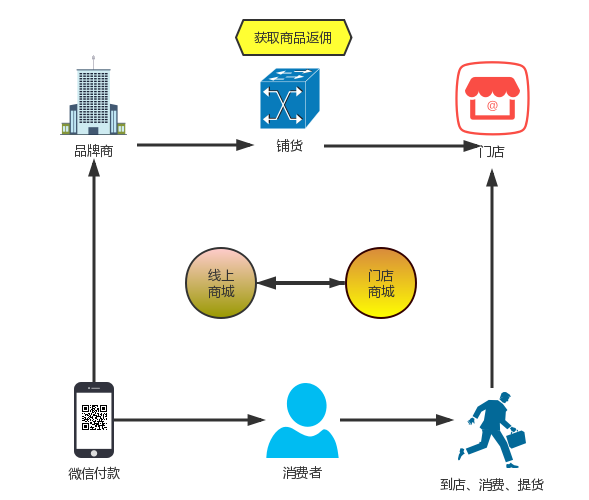 中心化支付,O2O營銷,會員到店掃碼線上下單,線下直接提貨,線上線下用戶雙向導流,同步返傭門店;