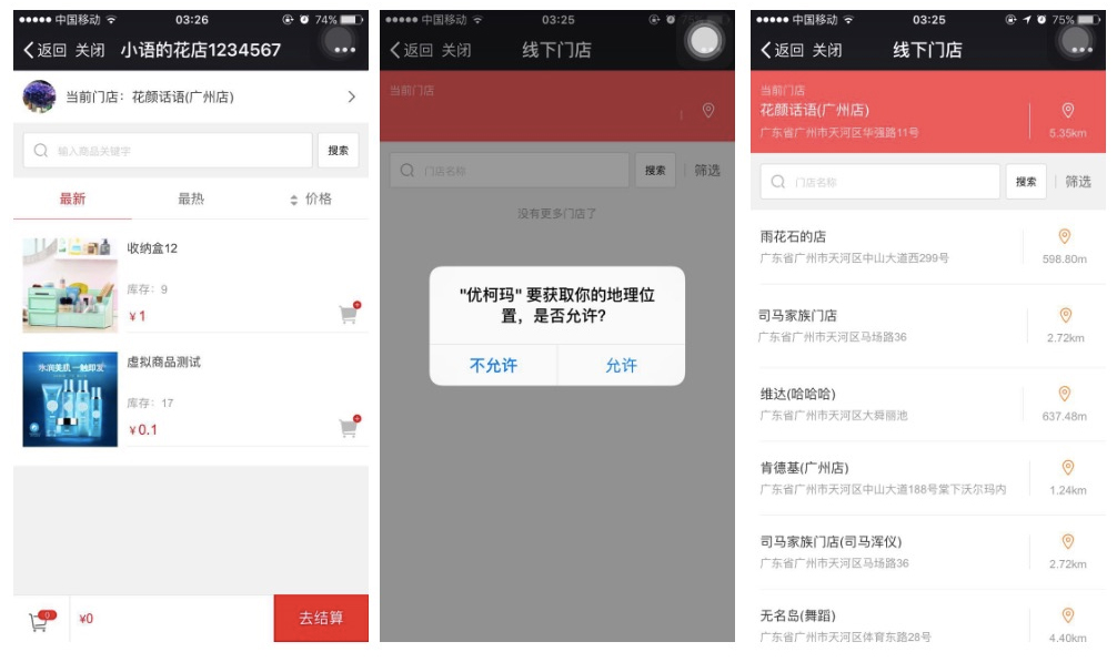 后臺添加門店時標注門店地址經緯度,用戶前端掃碼訪問門店商城,可查看附近門店(LBS定位)。