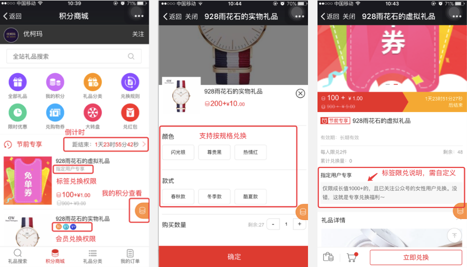 積分/積分+現金,按ID限時/訂單限兌數量,按會員等級/客戶標簽限制兌換的用戶范圍,自定義選用禮品運費模版。