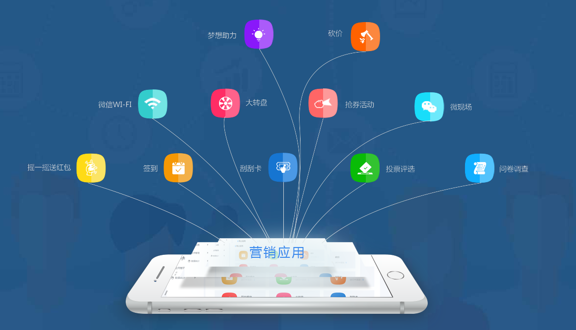 營銷應用目前包括:簽到、投票評選、砍價、大轉盤抽獎、刮刮卡抽獎、夢想助力、問卷調查、口令紅包、微現場、搖一搖送紅包共10款應用,可以適合任何規模的企業,是所有品牌和機構社會化營銷的最佳解決方案。