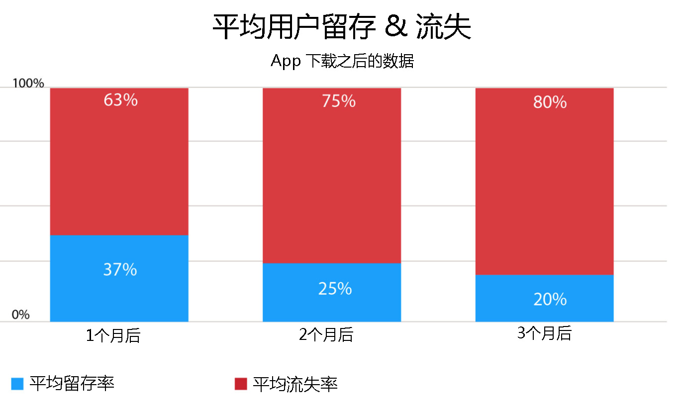根據(jù) ASO+ 數(shù)據(jù)顯示,一個 App 三個月以后的用戶流失率高達(dá) 80%。下圖的數(shù)據(jù)告訴我們,提高用戶留存迫在眉睫。