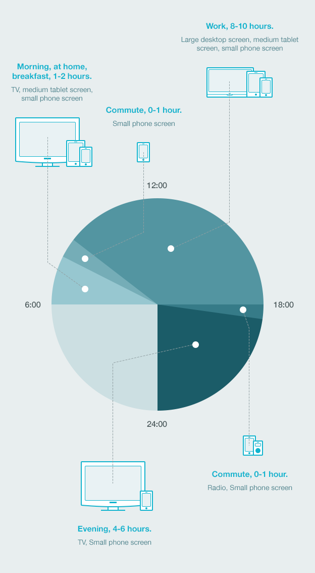 不同的設備組合通常是基于不同的場景、需求和服務來構成的,用戶會針對不同的屏幕進行不同模式的交互,甚至處理的內容也會有差異。比如說,在手機上,用戶更加傾向于使用輕量級的任務,并且進行一定量的溝通和交流。在平板上,用戶行為更多集中在內容消費上,并且目前平板的使用量被認為在逐步降低。桌面端依然是用戶完成較為專業、復雜任務的首選平臺,足以應付復雜多樣的內容。了解各種設備類型和使用場景是用來構建用戶體驗的關鍵。