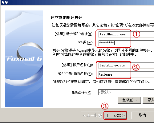 ·進(jìn)入 Foxmail 用戶(hù)向?qū)В斎?ldquo;電子郵件地址”、“密碼”、“帳戶(hù)名稱(chēng)”、“郵箱中采用的名稱(chēng)”以及路徑選擇 ,點(diǎn)擊“下一步”;