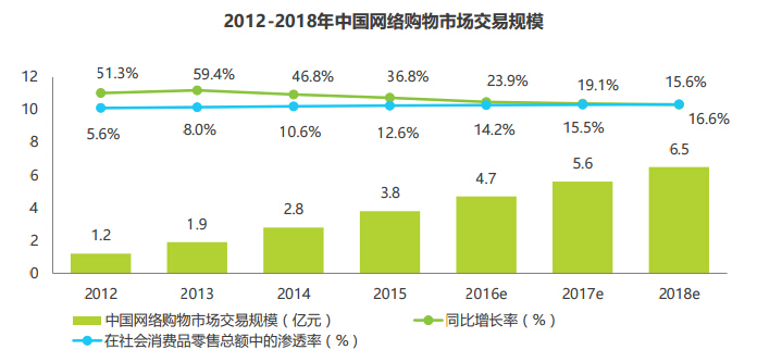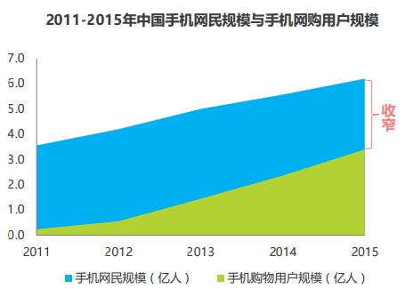 這里的第一個觀點提到兩個內(nèi)容,一個是移動電商進入下半場 ,另一個是移動端的流量紅利消失。第一個移動電商進入下半場,主要是從艾瑞數(shù)據(jù)研究發(fā)現(xiàn)整個電子商務市場的增長呈穩(wěn)定增長的趨勢(如圖一),2016年中國電子商務市場交易規(guī)模20.2萬億元,增長23.6%,其中,網(wǎng)絡購物占比為23.3%。網(wǎng)絡購物購依舊是零售的主流渠道,2016年中國網(wǎng)絡購物市場交易規(guī)模為4.7萬億元,占社會消費品零售 14.2%(如圖二),也就是說零售消費100元,有14.2元是來自網(wǎng)絡購物。網(wǎng)絡購物已進行移動消費時代,2016年中國移動網(wǎng)購在整體網(wǎng)絡購物交易規(guī)模中占比達到68.2%,比去年增長22.8個百分點,移動端 已超過PC端成為網(wǎng)購市場更主要的消費場景(如圖三)。第二個移動端的流量紅利消失,移動電商探索存量增值,2016年手機網(wǎng)民規(guī)模已達6.6億人,市場增量空間減少(如圖四)。