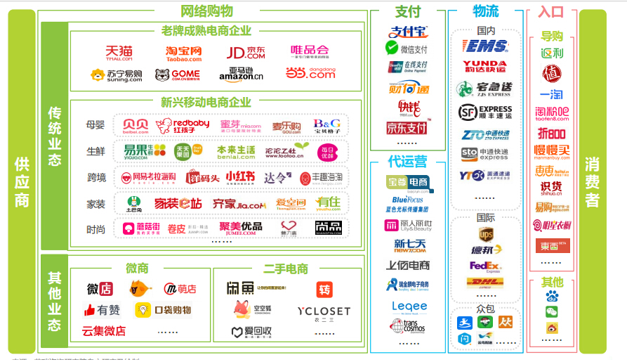 第二個觀點,可以發(fā)現(xiàn)老牌傳統(tǒng)的電商企業(yè),成功轉移至移動端,而且勢頭依舊。像淘寶、京東這些企業(yè)從2000年開始就在深耕電子商務。一些傳統(tǒng)業(yè)的一些新興移動電商企業(yè)也正在崛起,像母嬰行業(yè)的貝貝,紅孩子,生鮮行業(yè)的易果生鮮,家裝行業(yè)的土巴兔、家裝e站、齊家、愛空間、有住等。除了傳統(tǒng)行業(yè)外,還有一些新興的業(yè)態(tài),像微商、二手電商等。除了網(wǎng)絡購物這個平臺在發(fā)展外,電子商務的其它環(huán)節(jié)也在不斷的完善,像支付環(huán)節(jié),支付寶、微信、銀聯(lián)在線支付等都在慢慢被大眾所接受。物流的ems,韻達快運、順風速運等,(最近聽說順風也快要上市了,深入做好一個環(huán)節(jié),也可以做強做大哈)。在傳統(tǒng)的這些環(huán)節(jié)外,一些新興的環(huán)節(jié)也應運而生,如:2005年開始出現(xiàn)了幫助傳統(tǒng)電商企業(yè)進行 建站、物流、推廣等相應的的代理運營企業(yè),通過具備營銷、產(chǎn)品、客服、供應鏈等全方面的知識,然后可以跟傳統(tǒng)企業(yè)銷售分成。還出現(xiàn)了一些專門為消費者進行導購的網(wǎng)站,幫助引導消費者進行消費。(圖五)可以看到傳統(tǒng)的企業(yè)在垂直行業(yè)做大,代表了電商未來的新勢力(圖六)。