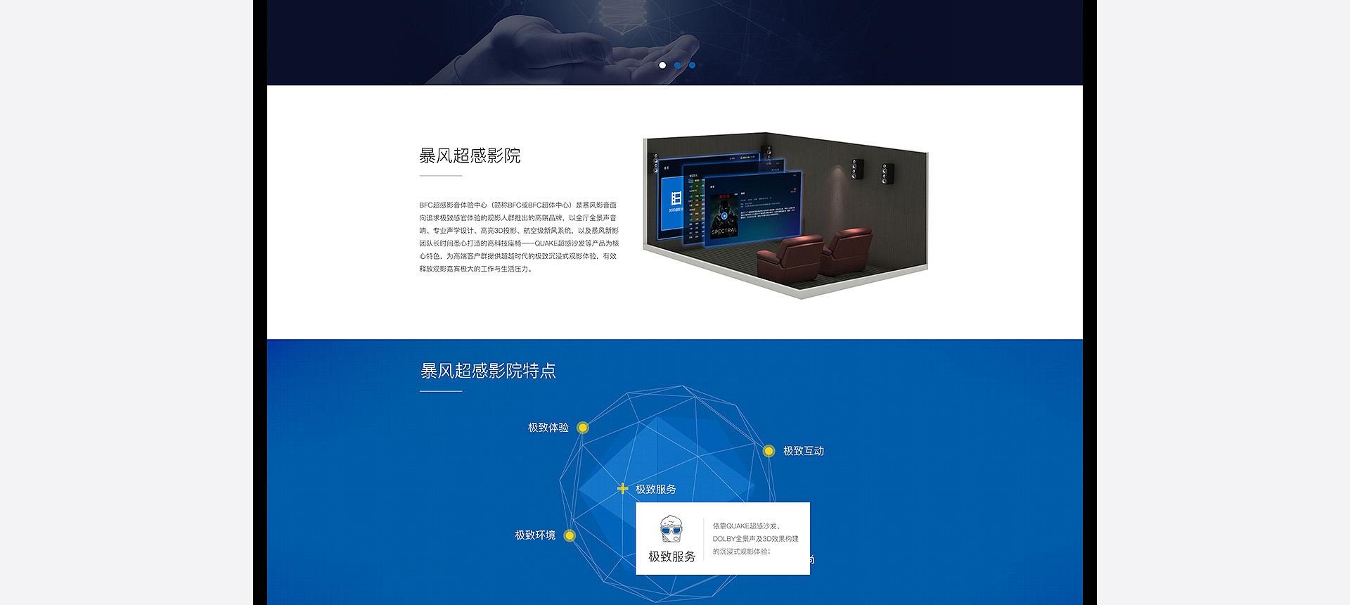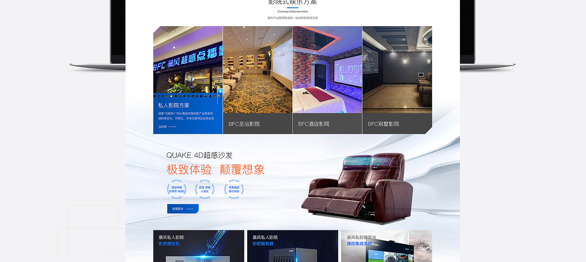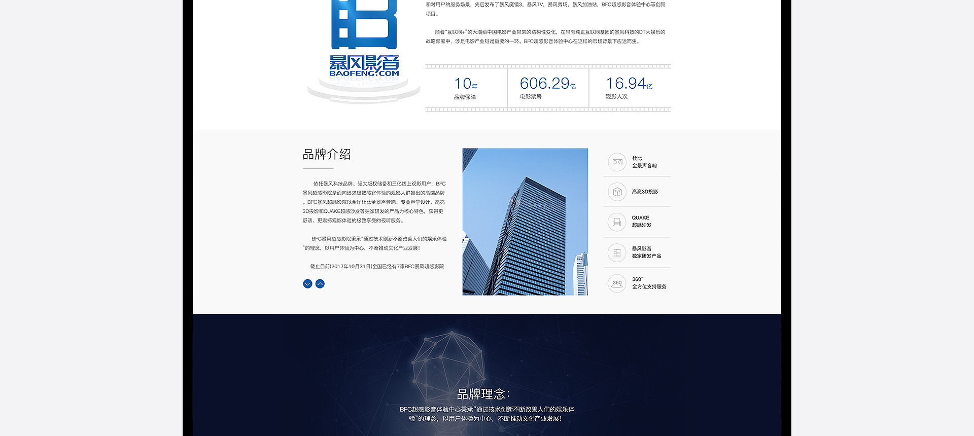 依托暴風(fēng)科技品牌、強(qiáng)大版權(quán)儲(chǔ)備和三億線上觀影用戶(hù),BFC暴風(fēng)超感影院是面向追求極致感官體驗(yàn)的觀影人群推出的高端品牌。BFC暴風(fēng)超感影院以全廳杜比全景聲音響、專(zhuān)業(yè)聲學(xué)設(shè)計(jì)、高亮3D投影和QUAKE超感沙發(fā)等獨(dú)家研發(fā)的產(chǎn)品為核心特色,獲得更舒適、更震撼觀影體驗(yàn)的極致享受的視聽(tīng)服務(wù)。 BFC暴風(fēng)超感影院秉承“通過(guò)...