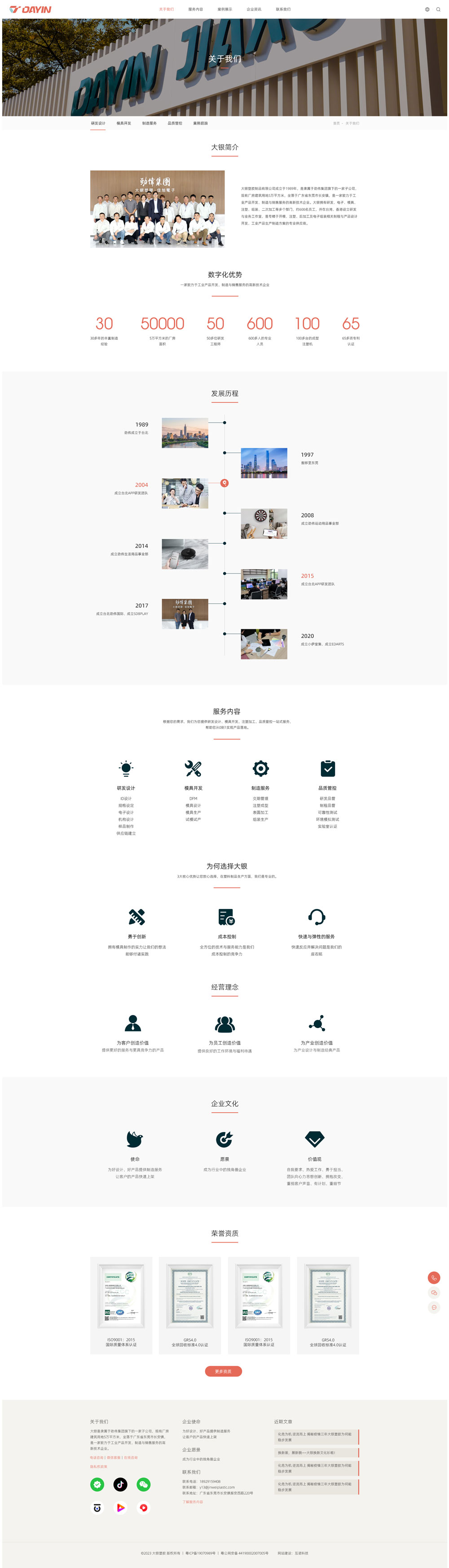 大銀塑膠制品有限公司是專注家電模具制造,提供OEM/ODM代工服務。公司成立于1989年,是一家集研發、制造服務于一體的制造方案供應商。專精于開模、注塑、后加工及電子組裝等相關制程。除代工服務外并研發自有產品可供客戶直接貼牌定制生產,自有產品分別為掃地機器人、塑膠餐具及電子飛鏢靶。 總部于東莞長安,我們擁有5000...