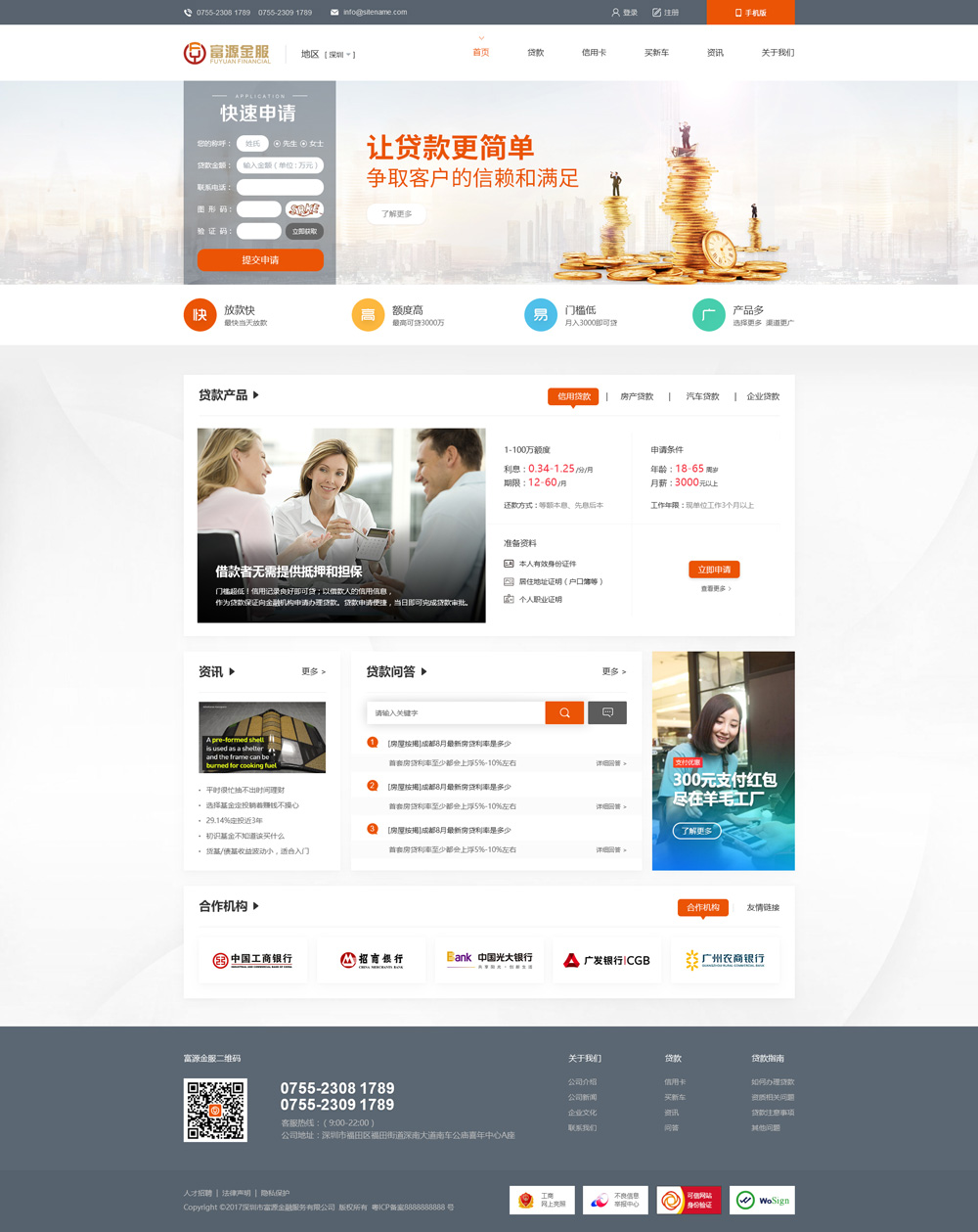 深圳市富源金融服務有限公司,是一家實力強大,具有豐富經驗的金融投資、咨詢服務機構,主要面向珠三角各中小型企業、業主及個人,提供項目融資、信貸融資、抵質押類融資方案分析及管理咨詢服務。公司與二十多家銀行建立長期穩定的合作關系,熟悉銀行的優惠政策和貸款方式。可以為客戶提供“一站式”銀行、消費金融、互聯網(小貸)貸款代辦服務,真正做到讓客戶省心、省時、省力。自公司成立至今,我司秉承“客戶至上,誠信經營”的宗旨和穩健的運營思路,已為不少客戶提供了貸款代辦服務,贏得了客戶的一致好評和贊譽。