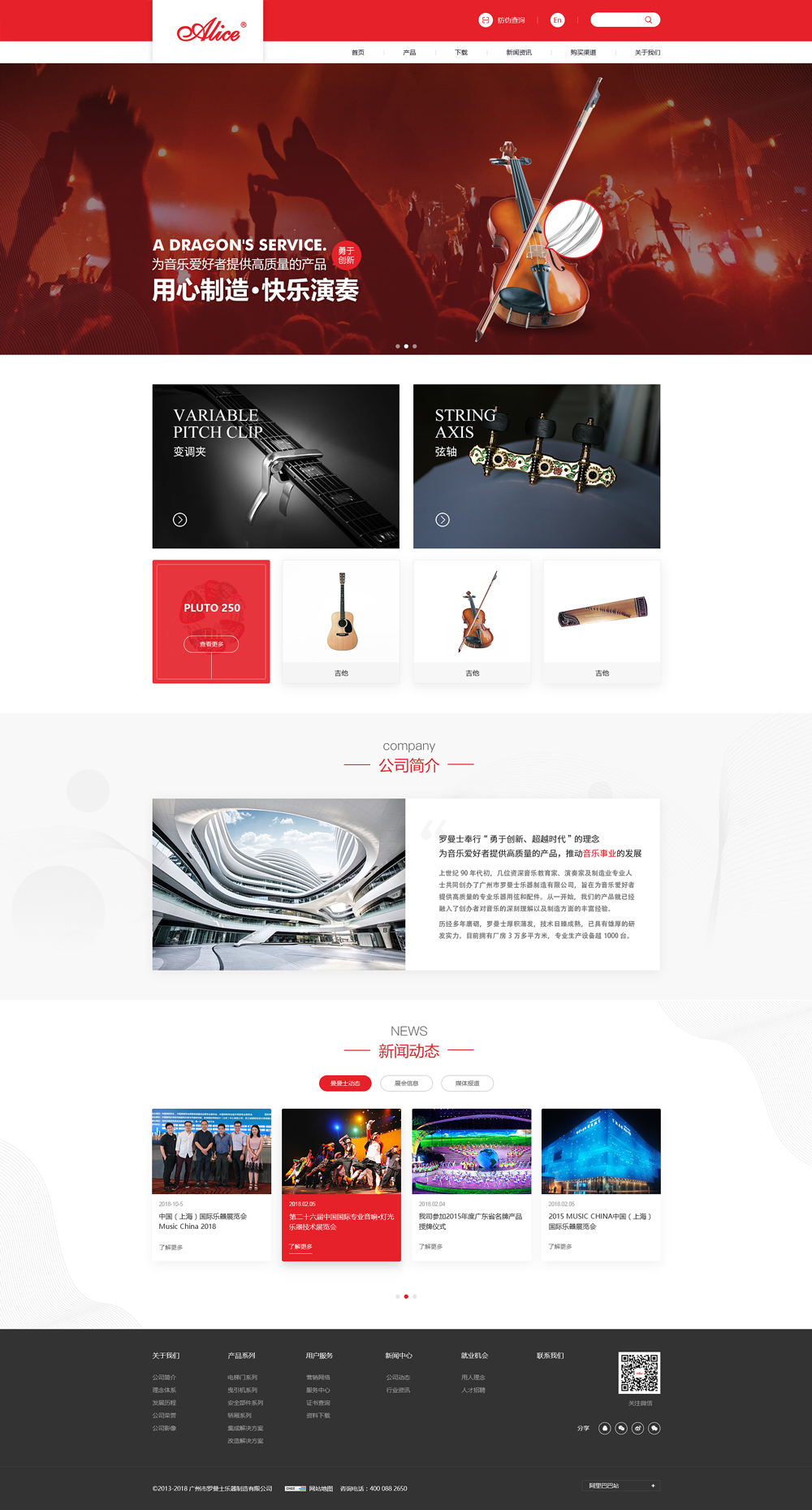 我們生產(chǎn)的產(chǎn)品超過2000種,滿足音樂愛好者各種需求,如古典吉他弦、民謠吉他弦、電吉他弦、貝司弦、提琴弦、民樂弦、西方民樂弦等琴弦,以及撥片、變調(diào)夾、弦軸等各種樂器配件產(chǎn)品。這些產(chǎn)品銷往世界各地,深受海內(nèi)外用戶歡迎。公司通過美國、德國、北京、上海、廣州等專業(yè)樂器展會,贊助各種專業(yè)比賽、音樂會等活動,以及《樂器》、《廣東樂器世界》、《中國樂器采購網(wǎng)》雜志等推廣, Alice品牌產(chǎn)品憑借優(yōu)良的品質(zhì),得到了國內(nèi)外消費(fèi)者的認(rèn)可和青睞。