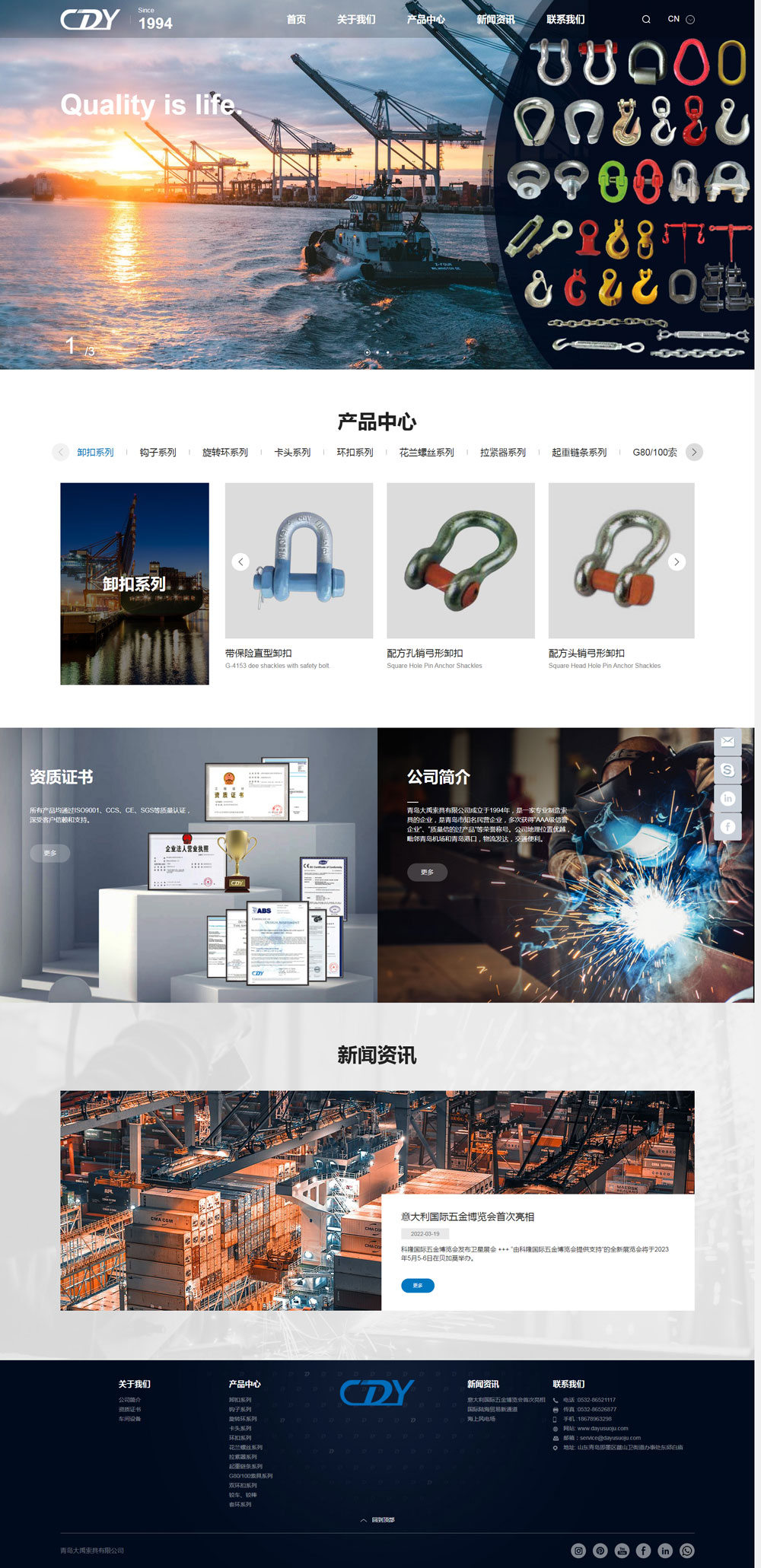 青島大禹索具有限公司成立于1994年(即墨市大禹索具廠),是一家專業制造索具的企業,是青島市知名民營企業,多次獲得“AAA級信譽企業”、“質量信得過產品”等榮譽稱號。公司地理位置優越,毗鄰青島機場和青島港口,物流發達,交通便利。 廠區規模近萬平米,產品銷往100多個國家和地區。 大禹索具主導產品為卸...