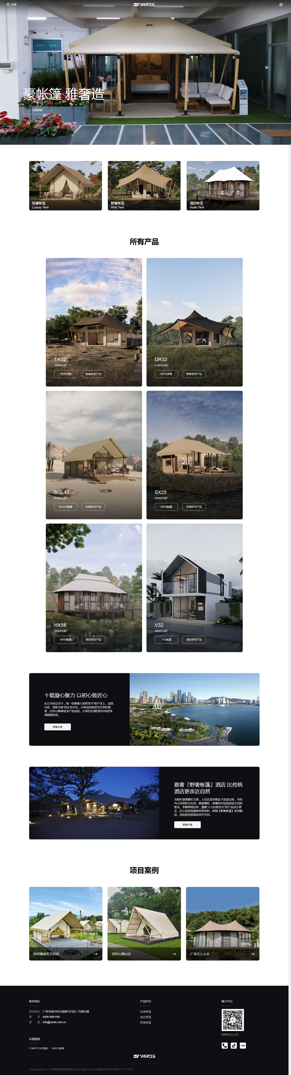 雅奢集團多年堅持自主研發(fā),培養(yǎng)了一支經(jīng)驗豐富、知識全面的技術(shù)團隊,掌握著酒店帳篷行業(yè)核心技術(shù),取得了國家數(shù)十項發(fā)明專利。雅奢集團陸續(xù)自主研制了酒店帳篷、球形帳篷、輕奢帳篷等多種酒店民宿帳篷建筑,目前已有35個篷房系列300個篷房單品。