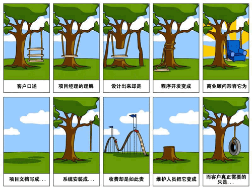 這張圖片說明的意思是:每個人都會站在自己的角度根據自己的經驗思考問題。要緊跟用戶的需求,做好需求分析,做好過程管理,以客戶為導向!
