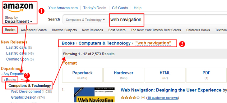 圖6是在amazon瀏覽到web navigation的搜索結(jié)果頁。圖中將隱藏的頁面路徑和實(shí)際存在的面包屑都標(biāo)示出來了。面包屑的每個(gè)節(jié)點(diǎn)標(biāo)簽在頁面的其它導(dǎo)航方式中都有被選中的狀態(tài),且自上而下,從外到內(nèi)形成包含與被包含的關(guān)系,從而形成一個(gè)隱藏的頁面路徑。這里使用的導(dǎo)航方式和前面都不一樣,不止用了導(dǎo)航菜單,還使用了樹形的級(jí)聯(lián)菜單的方式。當(dāng)前頁面也不是用頁面標(biāo)題,而是直接用的實(shí)體面包屑的最后一級(jí)節(jié)點(diǎn)標(biāo)簽的強(qiáng)化樣式。這個(gè)頁面通過不同的方式完成了用戶的導(dǎo)航需求。