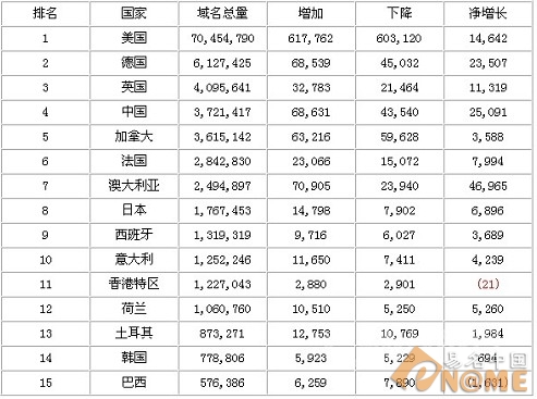 當(dāng)然,中國仍排在第四的位置,其域名注冊總量比2月的3,710,140,增長了11,277。不僅域名總量增加了,而且凈增長也從2月15的負增長到現(xiàn)在的正增長??傮w來說,域名總量比2月樂觀。在去年同期還落后于加拿大,中國自從“掃黃打非”專項治理到現(xiàn)在,CN域名的大幅度下降,也一定程度上制約著域名的增長。